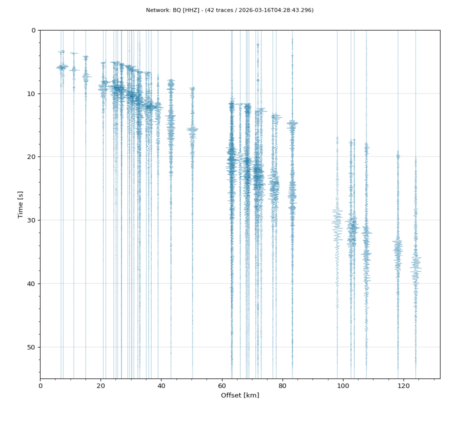 Op de horizontale as is de afstand in km weergegeven en op de vertikale as de tijd in seconden ten opzichte van de tijd van de beving. De data die getoond wordt is gefilterd met een Butterworth filter tussen 2 en 20 Hz. De stations zijn niet op dezelfde manier geschaald.