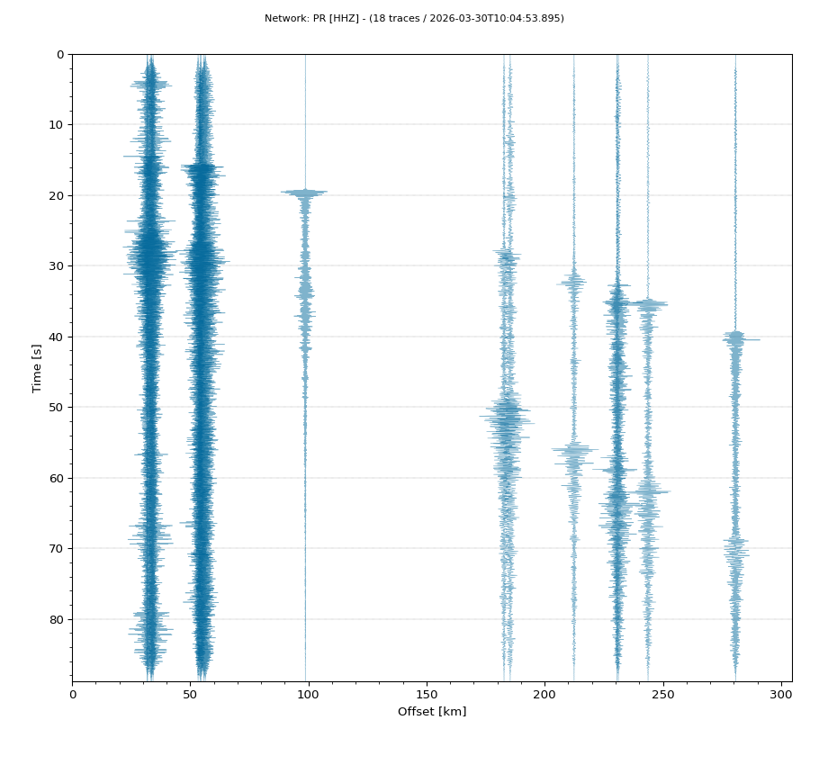 Op de horizontale as is de afstand in km weergegeven en op de vertikale as de tijd in seconden ten opzichte van de tijd van de beving. De data die getoond wordt is gefilterd met een Butterworth filter tussen 2 en 20 Hz. De stations zijn niet op dezelfde manier geschaald.