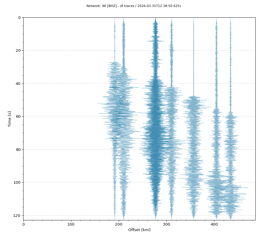 Op de horizontale as is de afstand in km weergegeven en op de vertikale as de tijd in seconden ten opzichte van de tijd van de beving. De data die getoond wordt is gefilterd met een Butterworth filter tussen 2 en 20 Hz. De stations zijn niet op dezelfde manier geschaald.