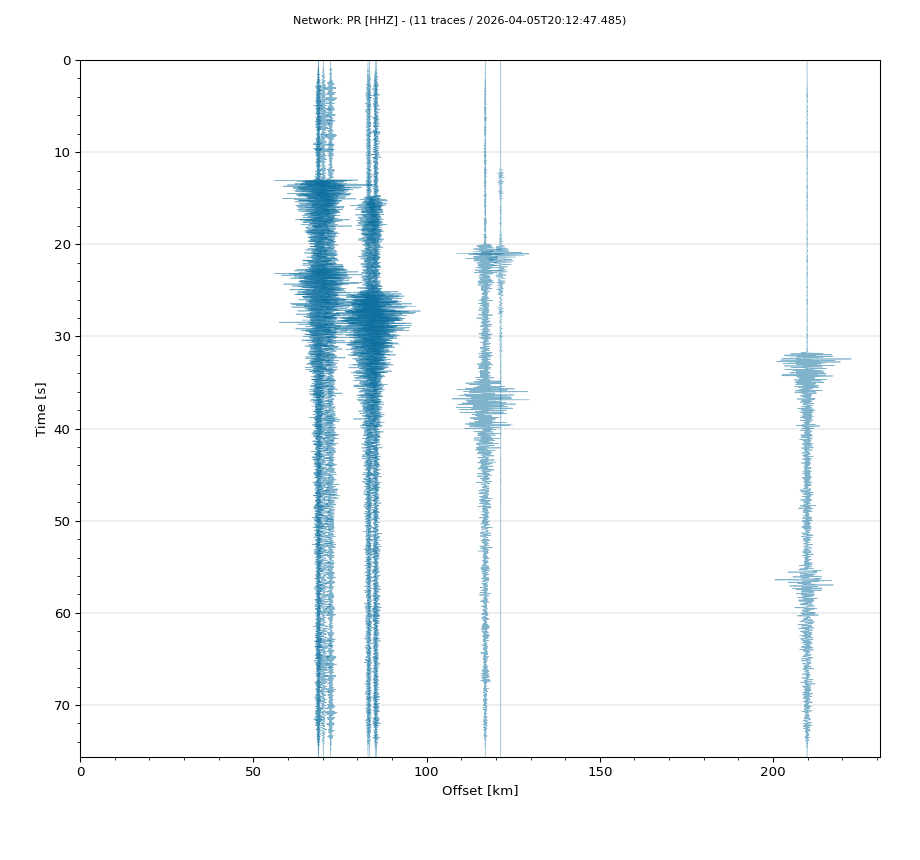 Op de horizontale as is de afstand in km weergegeven en op de vertikale as de tijd in seconden ten opzichte van de tijd van de beving. De data die getoond wordt is gefilterd met een Butterworth filter tussen 2 en 20 Hz. De stations zijn niet op dezelfde manier geschaald.