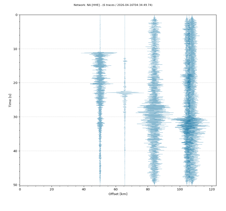 Op de horizontale as is de afstand in km weergegeven en op de vertikale as de tijd in seconden ten opzichte van de tijd van de beving. De data die getoond wordt is gefilterd met een Butterworth filter tussen 2 en 20 Hz. De stations zijn niet op dezelfde manier geschaald.