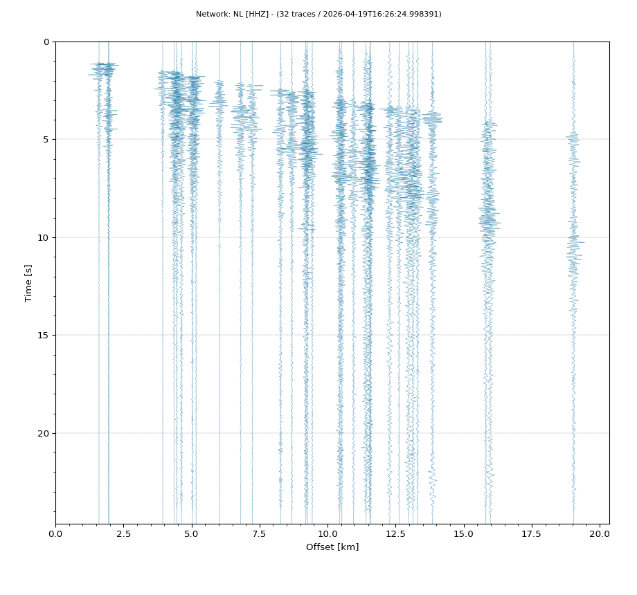 Op de horizontale as is de afstand in km weergegeven en op de vertikale as de tijd in seconden ten opzichte van de tijd van de beving. De data die getoond wordt is gefilterd met een Butterworth filter tussen 2 en 20 Hz. De stations zijn niet op dezelfde manier geschaald.