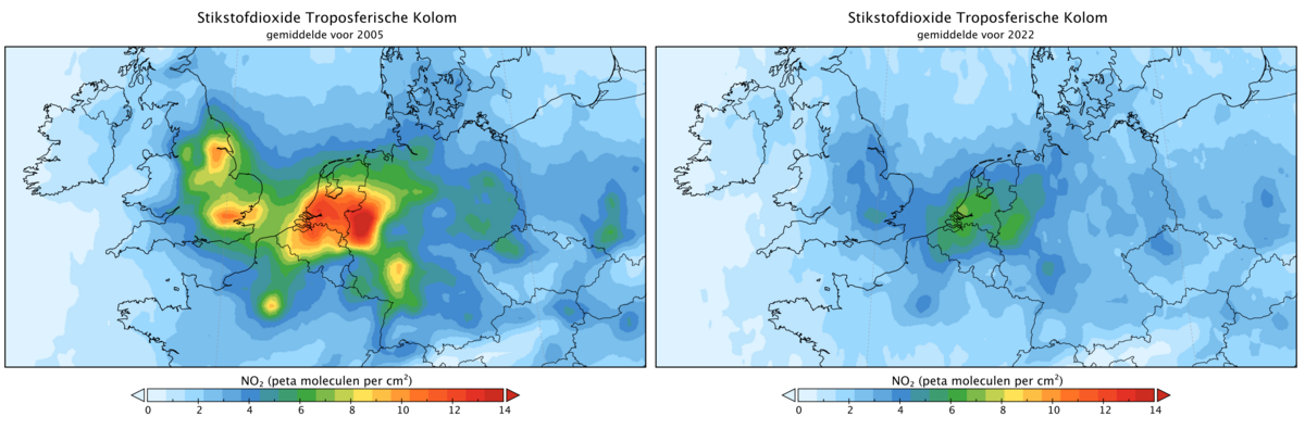 Uit OMI-metingen blijkt dat de concentratie stikstofdioxide in steden in Europa met 30 tot 50% is verminderd