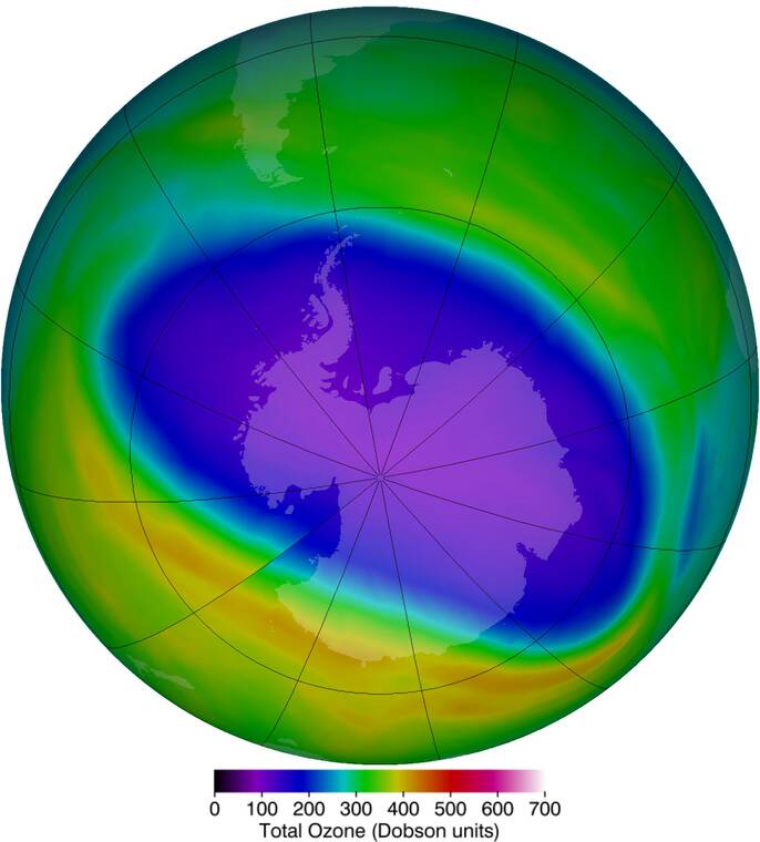 Ook monitoren we met de tijdreeks van OMI het ozongat boven de Zuidpool, waarmee het ook beter gaat doordat chloorfluorkoolwaterstoffen (cfk’s) uitgebannen zijn.