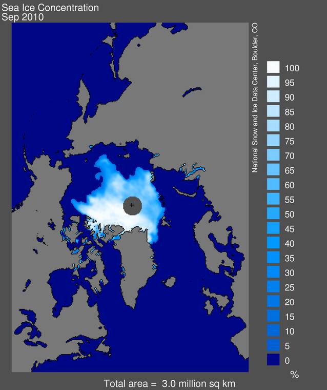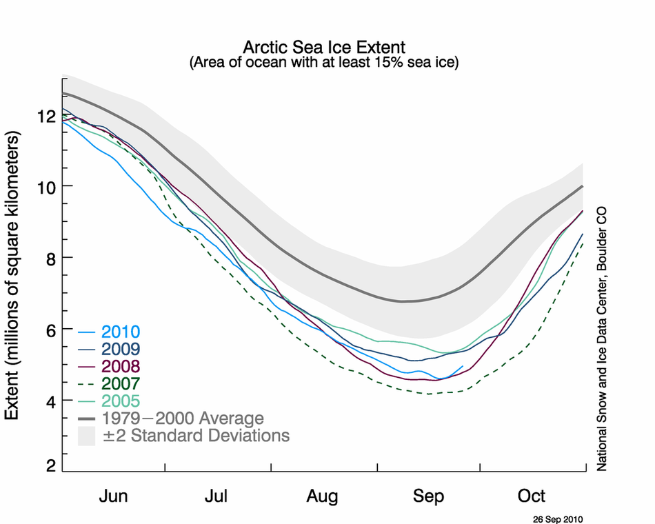 Door kouder weer in juli en augustus in het Noordpoolgebied is er meer zeeijs overgebleven dan in 2008. Met een minimum ijsbedekking van 4,60 miljoen km2 komt 2010 op de derde plaats van jaren met het minste Noordpoolijs. Het grootst gemeten minimum blijft 2007 met 4,10 miljoen km2 in 2007. Tweede staat 2008 met 4,56 miljoen km2. Hiermee komt de waarde van 2010 precies op de sterk dalende trendlijn te liggen.