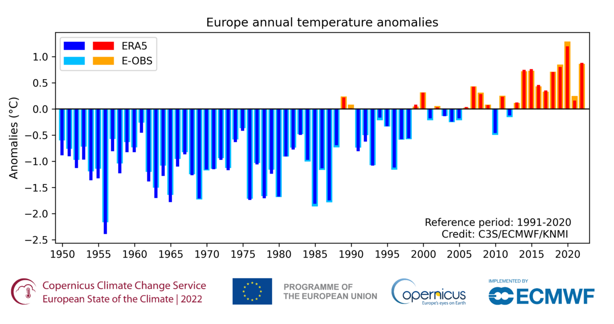 In Europa was de jaargemiddelde temperatuur opnieuw hoog in 2022. 2022 is het op één na warmste jaar ooit gemeten in Europa, met 0,9°C boven het gemiddelde. Deze hoge temperatuur is vooral te wijten aan de warme zomer, die de warmste was sinds 1950. 2022 past naadloos in de trend van verdere opwarming van het klimaat. Dit blijkt uit het nieuwste rapport van de Copernicus Climate Change Service (C3S). In het rapport wordt de balans opgemaakt van het Europese klimaat in 2022.