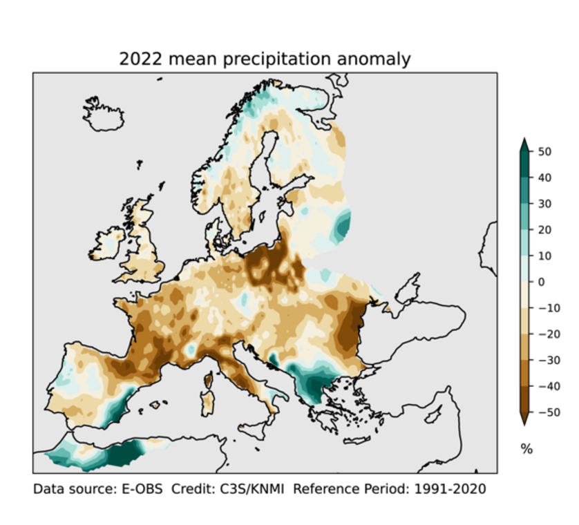In Zuidwest-Europa viel in de winter van 2021/2022 al minder regen dan gebruikelijk. Het gebrek aan neerslag zette zich door in het voorjaar en de zomer. Daardoor waren het voorjaar en de zomer voor vrijwel heel Europa droger dan gewoonlijk.