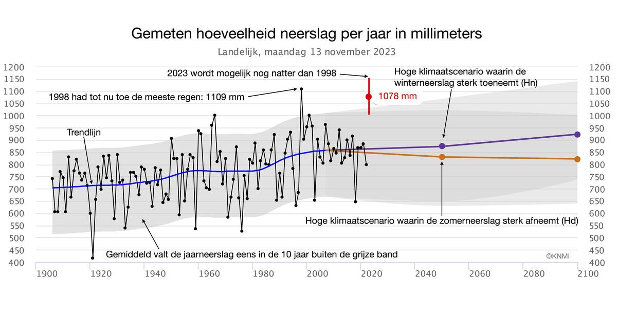 Dit jaar is hard op weg om daarbij in de buurt te komen. De hoeveelheid neerslag komt naar verwachting uit op 1079 millimeter. Maar als het in december ook natter dan normaal wordt zou 2023 wel eens het natste jaar tot nu toe kunnen worden.