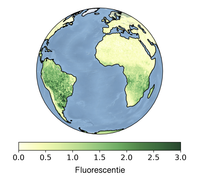 Satellietmetingen kunnen gebruikt worden om de CO2-opname van planten overal op aarde te meten (zie afbeelding 1). Hoe werkt dit? Tijdens fotosynthese gebruiken planten energie uit zonlicht om water en CO2 om te zetten in zuurstof en suikers, de bouwstoffen van planten. Tijdens dit proces straalt de plant een deel van het zonlicht weer uit als een zachte gloed: dit is fluorescentie. Satellieten kunnen de hoeveelheid licht die planten uitstralen meten (zie afbeelding 2). Fluorescentie is een gevolg van fotosynthese activiteit; zonder fotosynthese -en de daarmee gepaard gaande opname van CO2- wordt er geen fluorescentie waargenomen.