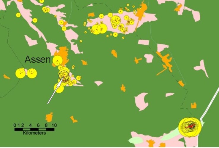 Op het kaartje hiernaast is duidelijk te zien dat de aardbevingen (gele cirkels) zich concentreren bij de gasvelden (roze gebieden).