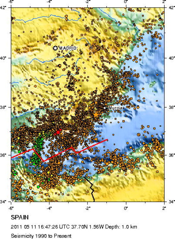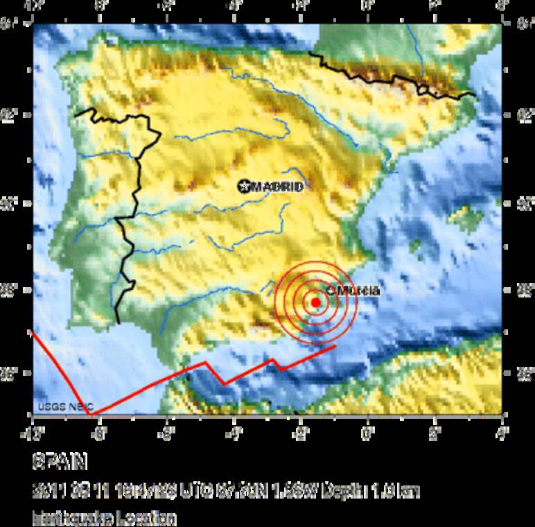 Het zuidoosten van Spanje is vanavond om 18.47 uur getroffen door een aardbeving met een magnitude van 5,3 op de schaal van Richter. Het epicentrum lag in de buurt van de stad Lorca op een diepte van slechts enkele kilometers.