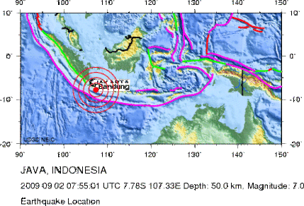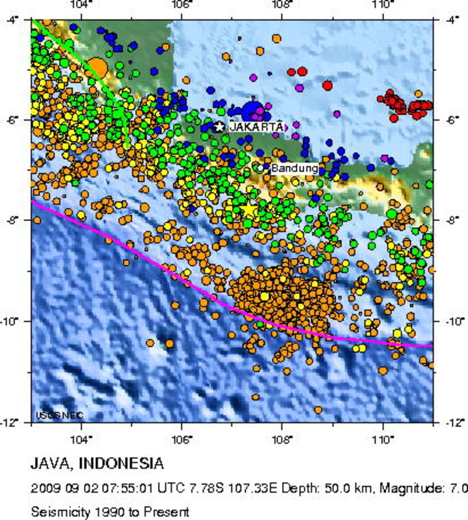 De zware aardbeving voor de kust van het Indonesische eiland Java afgelopen woensdag heeft op een diepte van 50 kilometer plaatsgevonden. Door deze grotere diepte is deze beving met een kracht van 7 op de schaal van Richter minder verwoestend geweest dan bijvoorbeeld de minder zware aardbeving bij Yogyakarta op 26 mei 2006.