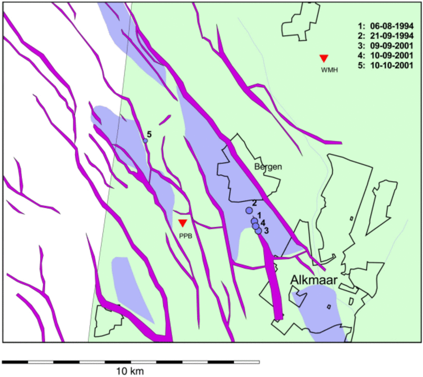 Het kaartje geeft de lokatie van de aardbevingen bij Alkmaar en Bergen aan Zee. De paarse vlekken op de tekening geven de lokatie van gasvelden in de regio aan, de roze lijnen geven breuken in de aardkorst weer (bron: NITG-TNO). De rode driehoeken geven de lokatie aan van de seismische (boorgat) stations van het KNMI.