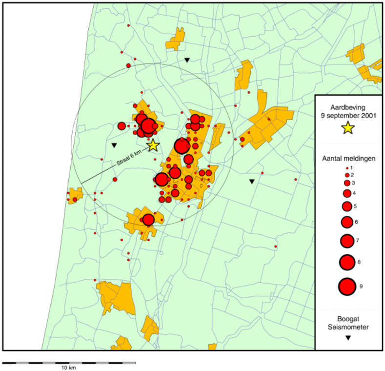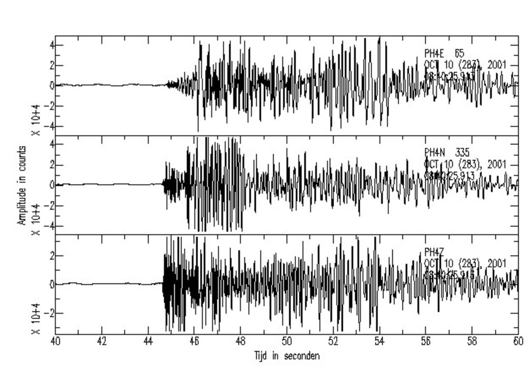 Hieronder nog een overzicht van de schademeldingen naar aanleiding van de twee aardbevingen bij Alkmaar en de registratie van de aardbeving van 10 oktober door het KNMI-station Philisteinsche Polder (PPB) op ongeveer 3 km afstand van het epicentrum.