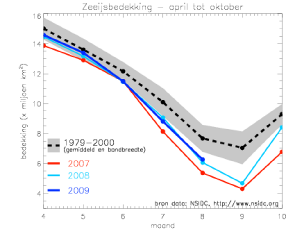 De ijsbedekking in het noordpoolgebied ligt nu iets boven het niveau van 2008. Echter, het huidige niveau ligt ver boven 2007, het jaar dat het meeste Noordpoolijs gesmolten is sinds de ijssmelt gemeten wordt. Het is zeer onwaarschijnlijk dat het ijsminimum van die zomer dit jaar gehaald gaat worden. De weersomstandigheden van augustus hebben ervoor gezorgd dat het zeeijs zich ophoopt aan de kust tussen Spitsbergen en Nova Zembla en dat de ijsafvoer via Fram Strait - tussen Groenland en IJsland – relatief klein is gebleven. Hierdoor blijft de ijsafname relatief beperkt.
