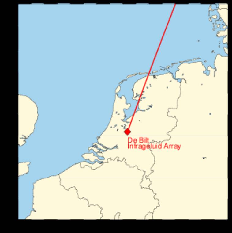 Metingen van akoestische (infrageluid) instrumenten laten trillingssignalen in de atmosfeer zien. De bron bevond zich ergens ten noord(oosten) van de Waddeneilanden. Dit is bepaald met de metingen van het infrageluid-array in De Bilt, zie de figuur hiernaast.