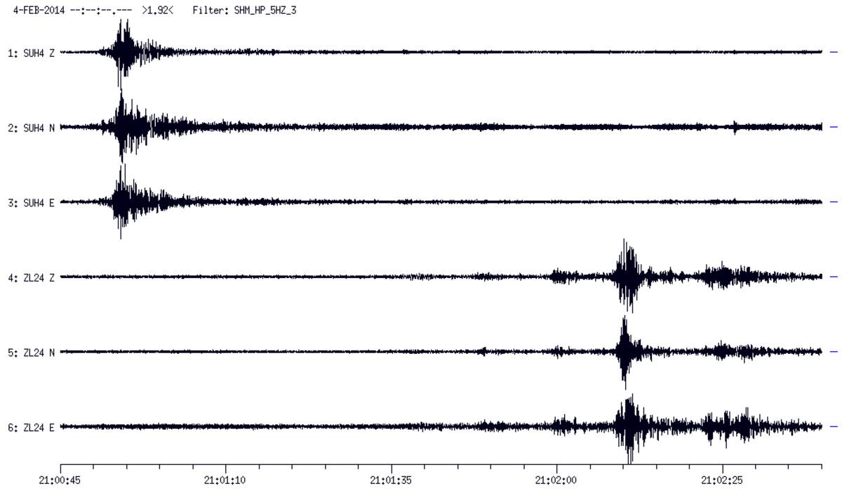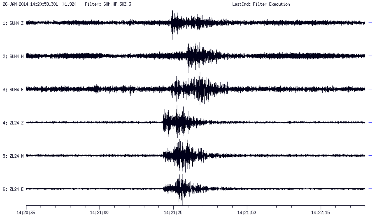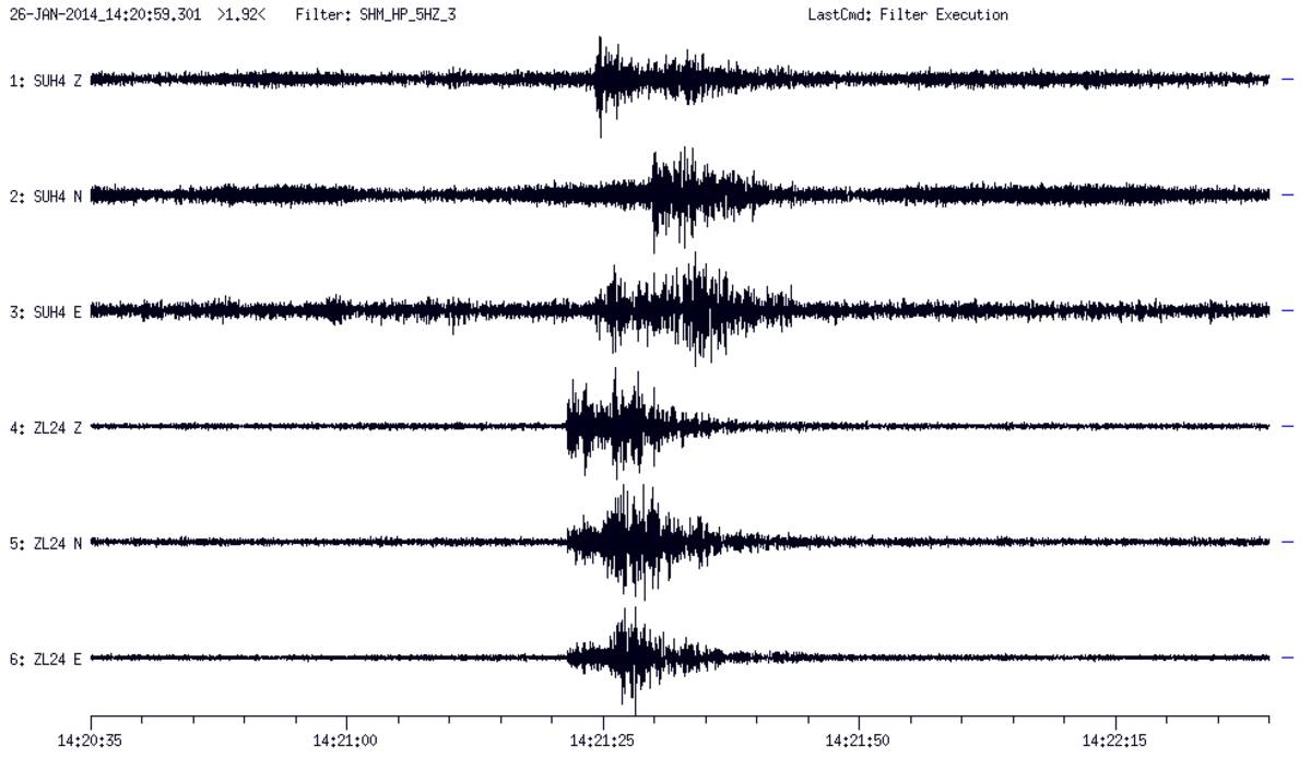 De tweede figuur geeft de registratie van een aardbeving op 26 januari 2014 gemeten in dezelfde stations. De signaalvorm (scherpe impuls) en het korte tijdsverschil tussen de twee stations zijn karakteristiek voor een aardbeving.