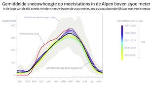 De buitengewoon grote hoeveelheid neerslag heeft alleen in de Alpengebieden boven 2500 meter geleid tot bovengemiddelde sneeuwdiktes (afbeelding 1 rechtsonder en afbeelding 2). Dit is een direct gevolg van de zachte winter. Op veel Zwitserse meetstations zijn bijvoorbeeld in begin december top vijf dagrecords gehaald met een sneeuwdump van 50 tot 70 cm. De vreugde was echter van korte duur omdat een paar dagen later het nulgradenniveau (de sneeuwvalgrens) alweer op 2200 meter lag, de sneeuw smolt en de overvloedige regen de sneeuw deels wegspoelde. Eind december lag er dan ook 90 procent minder sneeuw op 1000 meter dan gemiddeld over 1991-2020.