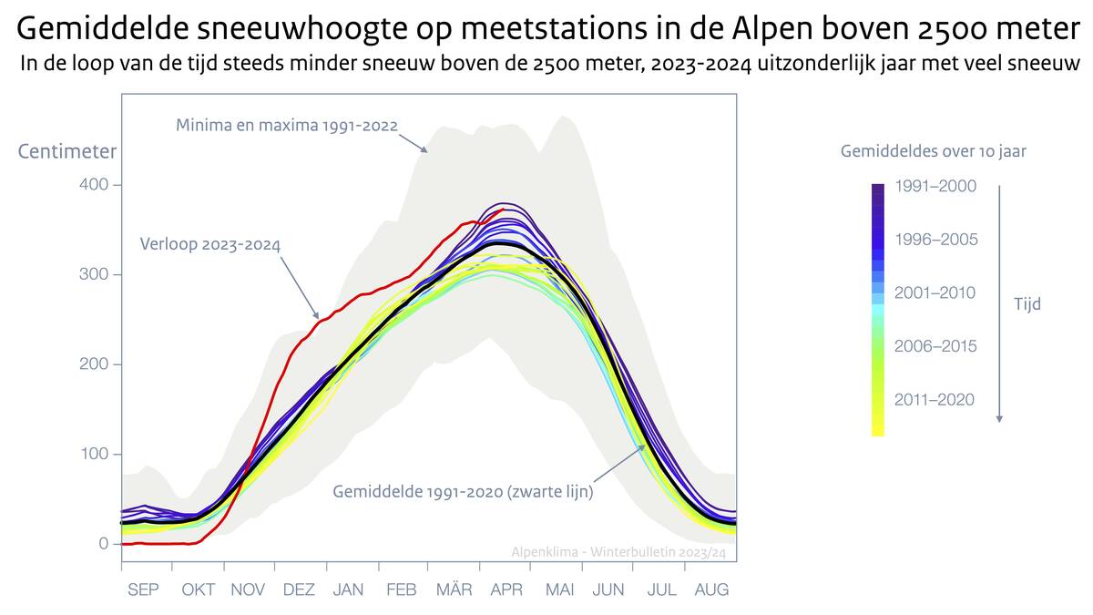 De Alpenwinter van 2023-2024 is de tweede warmste na die van 2006-2007. Februari verliep recordwarm met 5,1 °C boven het langjarig gemiddelde van 1991-2020. De winter werd, net als in Nederland, gekenmerkt door een aanvoer van Atlantische lagedrukgebieden die veel neerslag brachten. Plaatselijk viel er tot drie keer zoveel neerslag als gemiddeld (afbeelding 1). Ook werd zachte lucht aangevoerd vanuit zuidwestelijke richting. De nationale weerdiensten van Duitsland, Zwitserland en Oostenrijk hebben het weer van de afgelopen winter samengevat in een rapport wat twee keer per jaar uitkomt, het Alpenklimaat winter 2023-2024.