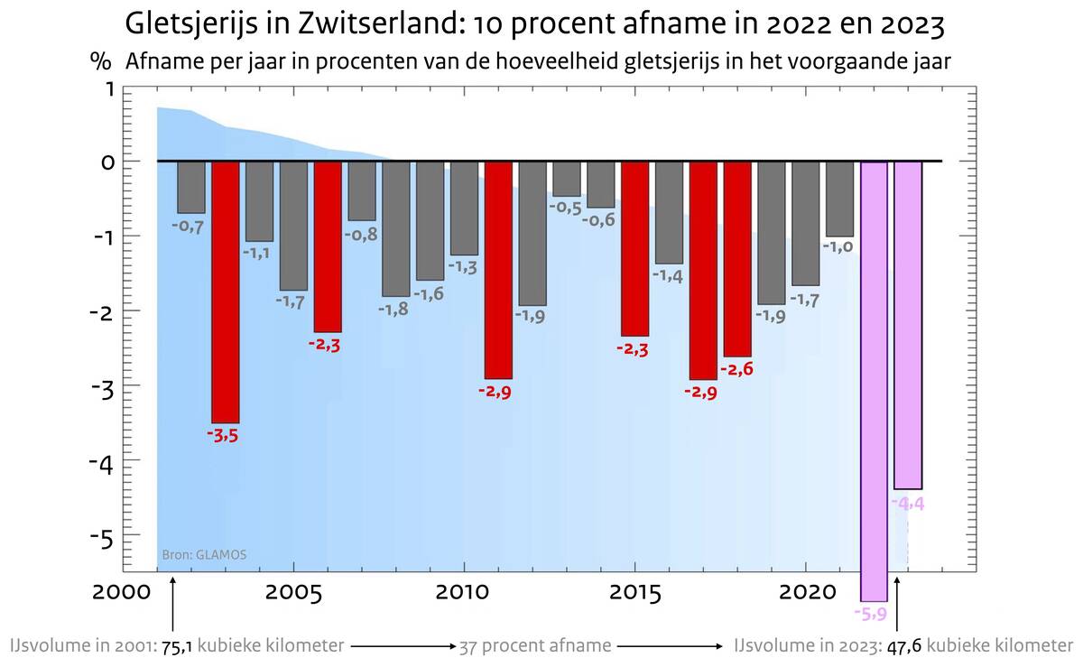 Een sneeuwrijk einde van de lente geeft helaas geen garantie op een zomer en herfst met weinig afsmelt van de gletsjers. In 2023 begonnen de Oostenrijkse gletsjers in de Hohe Tauern de zomer met een goede beschermlaag door sneeuwval in de lente, maar door de bovengemiddeld warme zomer en herfst komt 2023 op de tweede plaats, na 2022, met hoogste massaverlies. De Zwitserse gletsjers zijn de afgelopen twee jaar 10 procent gesmolten (afbeelding 3), een hoeveelheid die vergelijkbaar is met het ijsverlies in dertig jaar tijd tussen 1960-1990. De winter van 2023-2024 heeft 30 procent meer sneeuw dan gemiddeld op de gletsjers gebracht en dit geeft voorzichtige hoop op een rustpauze voor de gletsjers deze zomer. De Zwitserse gletsjerwerkgroep GLAMOS merkt op dat de goede sneeuwbedekking van de winter 2023-2024 ook een keerzijde heeft: de bodemwarmte van de zomer van 2023 zit opgeslagen onder het isolerende sneeuwdek en warmt de permafrostlagen nog maandenlang op.