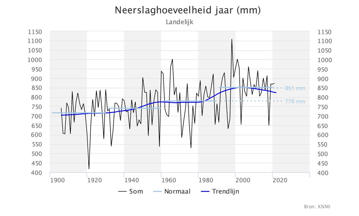 Als maat voor de jaarlijkse hoeveelheid neerslag in Nederland (de jaarsom) nemen we de gemiddelde neerslag gemeten op 13 neerslagstations verspreid over het land. De jaarsom is sinds 1906, het begin van onze neerslagmetingen, geleidelijk toegenomen (figuur 1). Tussen de perioden 1961-1990 en 1991-2020 ging de jaarsom van gemiddeld 779 naar 851 millimeter, een toename van 72 millimeter oftewel 9 procent.