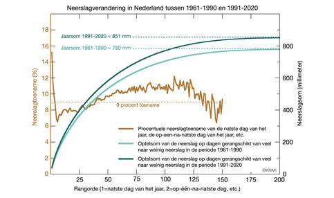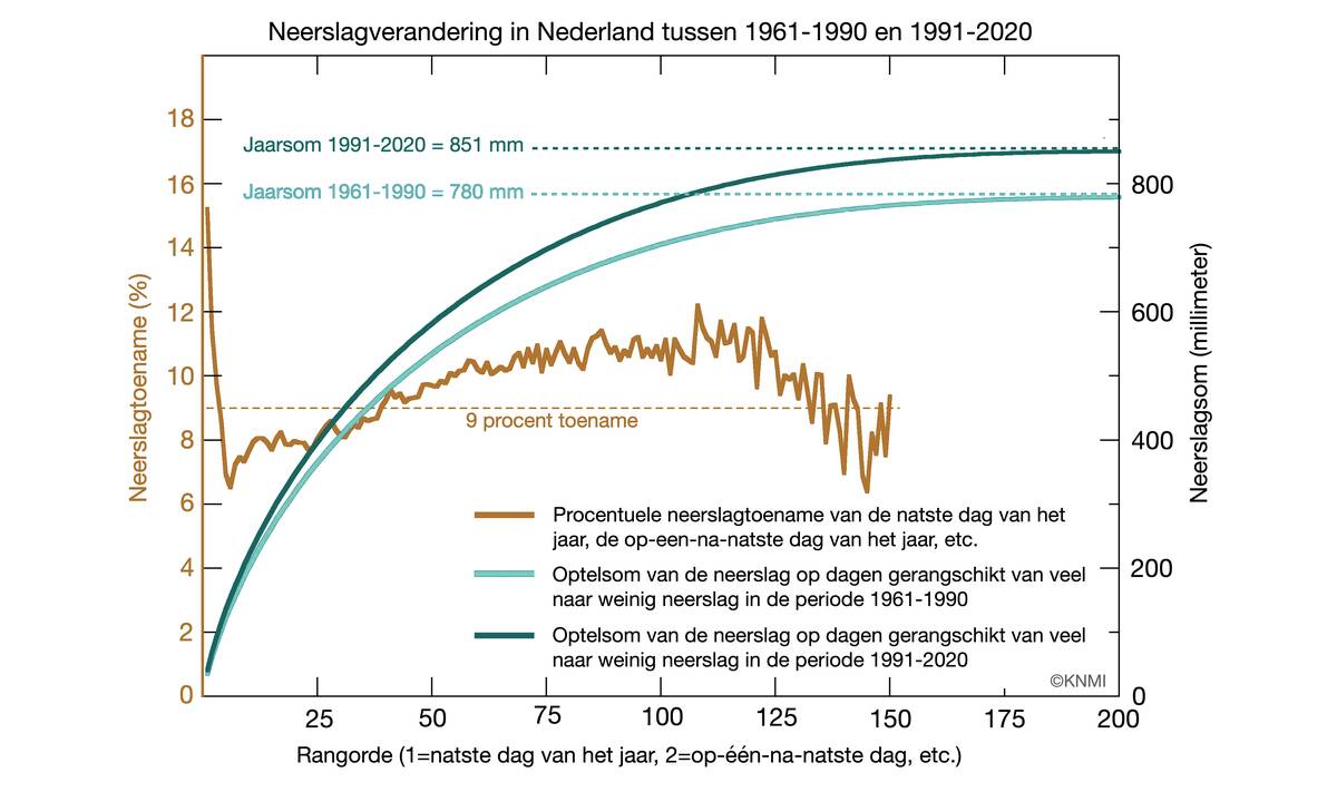 De gemiddelde hoeveelheid neerslag per jaar is in Nederland tussen 1961-1990 en 1991-2020 met 9 procent toegenomen. Dit geldt ook voor de gemiddelde hoeveelheid neerslag per dag, van de zeer natte dagen tot de dagen met weinig neerslag. Het aantal dagen met enige neerslag van betekenis is nagenoeg gelijk gebleven. Op extreem natte dagen is de toename sterker.