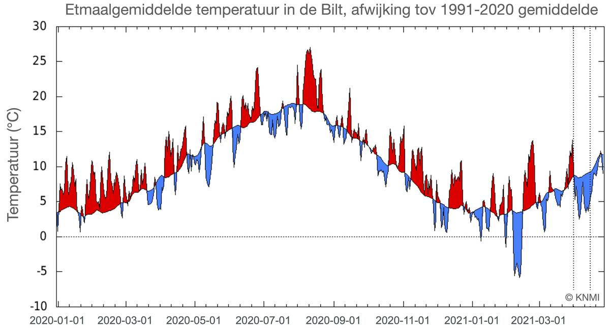 Met gemiddeld 5,2 graden was de temperatuur over 1 tot en met 15 april ongeveer drie graden lager dan de nieuwe normaal (het gemiddelde over 1991–2020, figuur 1). Vergeleken met de opwarmende trend is dit vrij uitzonderlijk, alleen in 1903 en 1979 kwamen grotere afwijkingen ten opzichte van de trend voor.