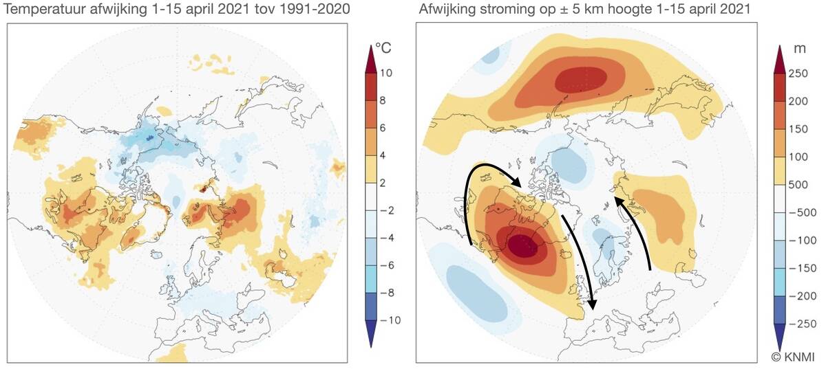 De eerste helft van april werden de weerkaarten gedomineerd door een hogedrukgebied bij Groenland en een minder sterk lagedrukgebied boven Scandinavië (figuur 2). Dit komt in het voorjaar vaker voor: de Atlantische Oceaan is nog koud van de winter en dan vormt zich sneller een hogedrukgebied bij Groenland. Met de wet van Buys Ballot geeft dit een sterke stroming van de Noordpool naar Nederland: ijskoude, heldere lucht komt naar het zuiden, en boven de relatief warme zee komen daarin winterse buien tot ontwikkeling. In de heldere nachten kan nog nachtvorst voorkomen, zelfs als de temperaturen overdag al weer oplopen in de krachtiger wordende voorjaarszon.