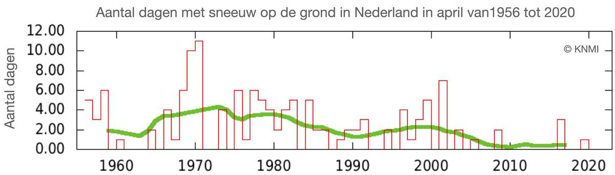 We hebben ook in de archieven naar sneeuw waarnemingen gekeken. De ruim 330 vrijwilligers die elke morgen de regenhoeveelheid meten, noteren ook hoeveel sneeuw er ligt. Tot het jaar 2000 zag tenminste één ervan sneeuw liggen op twee tot vier dagen in april. In 1970 lag er zelfs op 11 dagen sneeuw in april. Sindsdien is dat veel minder. Aprilletje zoet had nog wel eens een witte hoed, tegenwoordig echter nog maar zelden.