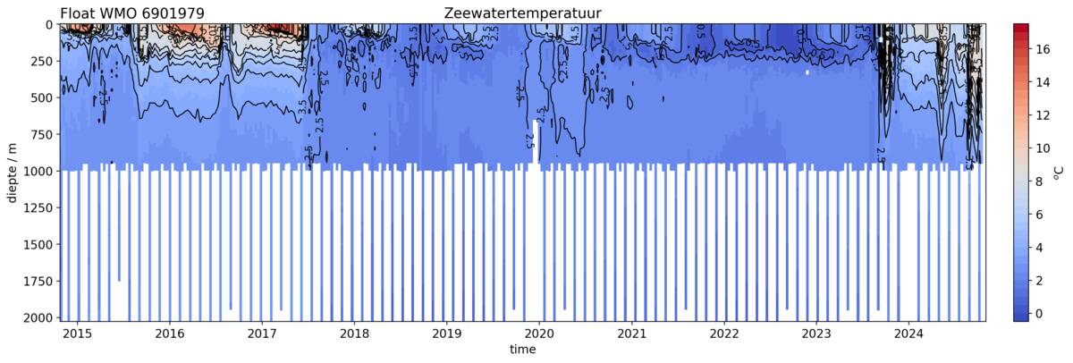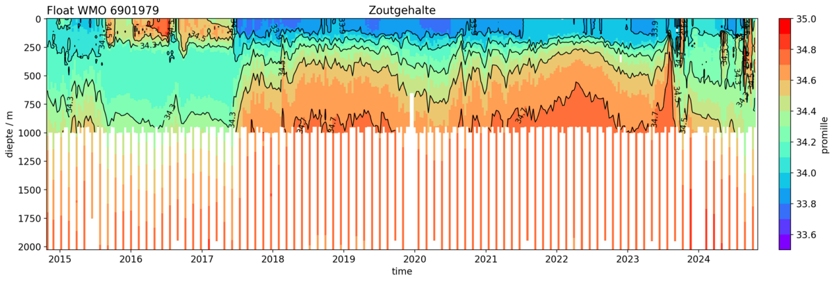 Argo float 6901979 is intussen 366 keer tussen het oppervlak en 2 kilometer diepte op- en neergegaan en heeft daarbij een reis van meer dan 13 duizend kilometer afgelegd (figuur 1), van Zuid-Amerika tot ergens ten zuiden van Australië. Nadat hij vlak voor de kust van Argentinië te water gelaten werd, heeft hij meer dan twee jaar rondjes gedraaid in een grote wervel (figuur 1). Uit die wervel is hij in 2017 ontsnapt. Dat is goed te zien in figuur 2: in de wervel werd het water aan het oppervlak in de zomer nog vrij warm (tot 15 graden), en het was zout (figuur 3). Na 2017, uit de wervel, bereiken de temperaturen amper 3 graden, en het zoutgehalte is gezakt van 34,7 promille naar 33,7. Tegelijk is het onder de 250 meter veel zouter geworden.