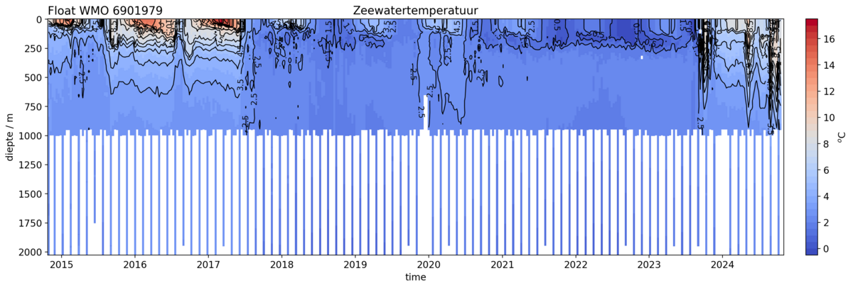 De jarige 6901979 is een van acht identieke floats die in de zomer op het zuidelijke halfrond - onze winter van 2014-2015 - in de Zuid-Atlantische Oceaan te water gelaten werden. Een ervan heeft nooit iets van zich laten horen, twee andere zijn er na ongeveer vier jaar mee gestopt, en bij vier doet de zoutsensor het al lang niet meer.