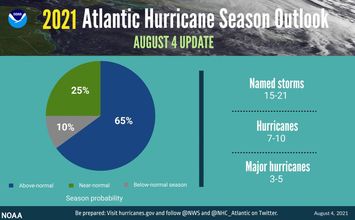Begin deze maand hebben weerinstituten een update gegeven voor het seizoen 2021. Het Amerikaanse NOAA geeft 65% kans op een bovengemiddeld actief jaar (figuur 1). Ze verwachten 15 tot 21 stormen waarvan 7 tot 10 orkaan, inclusief 3 tot 5 van categorie drie of hoger. Het gemiddelde van 1991-2020 is 14 stormen, 7 orkanen en 3 van categorie drie of hoger. Het Britse Met Office zit meer rond normaal met zijn verwachting.