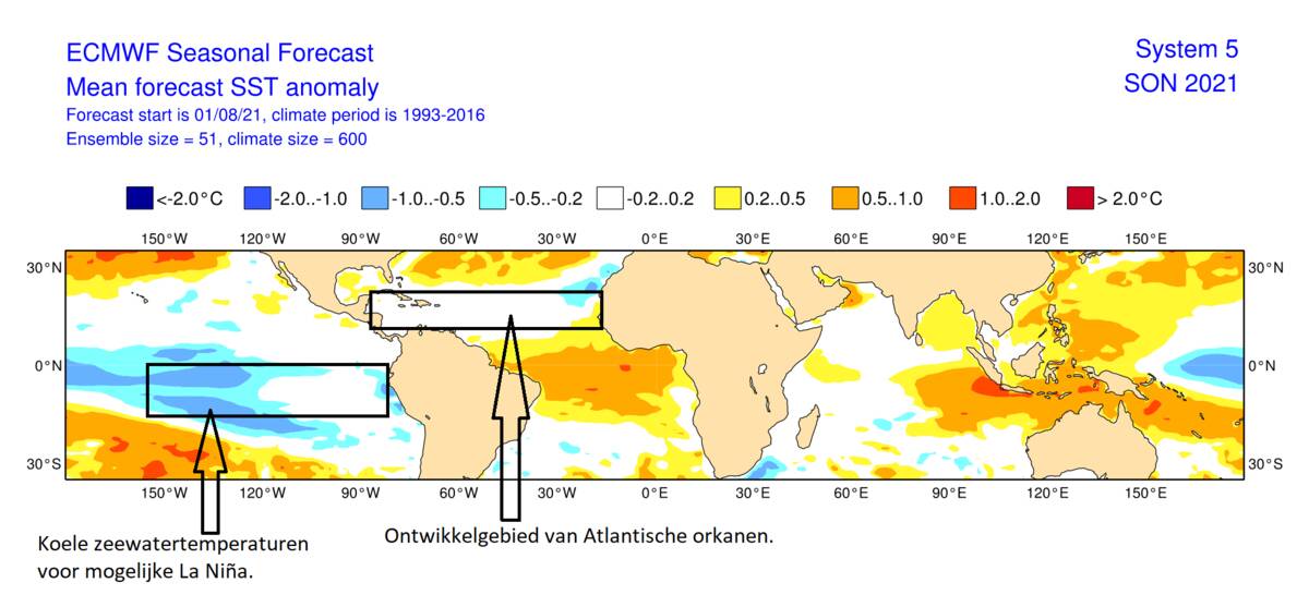 Aanwijzingen voor een actief seizoen zijn onder andere een actieve moesson in West-Afrika waar veel orkanen hun oorsprong vinden en dit najaar mogelijk de ontwikkeling van La Niña wat gewoonlijk gepaard gaat met meer stormactiviteit boven de tropische Atlantische oceaan. In de verwachte zeewatertemperaturen voor september-november zien we temperaturen van beneden normaal in de Grote Oceaan rond de evenaar, een teken van La Niña (figuur 2). Ook zien we dat in het ontwikkelgebied van Atlantische orkanen de zeewatertemperatuur verwacht wordt normaal te blijven. Hogere zeewatertemperaturen zoals in 2020 gaan gewoonlijk gepaard met actievere stormen.