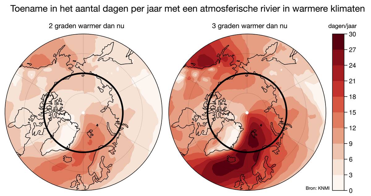 De meeste atmosferische rivieren komen in de gematigde klimaatzones voor, met name boven de Atlantische en Stille Oceaan (figuur 2), maar in een warmer klimaat bereiken ze ook steeds vaker gebieden boven de poolcirkel (figuur 3). Bij 3 graden klimaatopwarming zouden volgens berekeningen met het KNMI-klimaatmodel EC-Earth 33% meer atmosferische rivieren voorkomen in het noordpoolgebied en transporteren deze per keer gemiddeld 18% procent meer waterdamp. Dit waterdamptransport gaat over het algemeen vaak samen met toevoer van warmte. Mede daardoor kunnen atmosferische rivieren in het poolgebied naast extreme neerslag ook zorgen voor het versnelde opwarming en smelten van land- en zee-ijs, met name in en rondom de Barents Zee waar de meeste atmosferische rivieren het Arctische gebied binnentrekken.