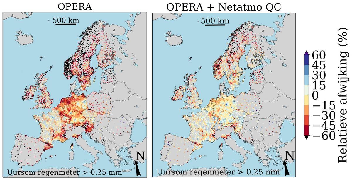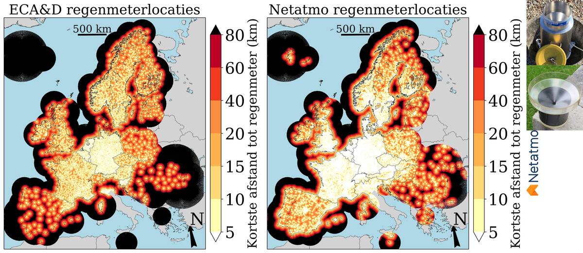 Met data van sensoren van derden, die soms niet eens voor regenmeting ontworpen zijn, kunnen we meer metingen toevoegen en kan de kwaliteit van radarbeelden verder worden verhoogd. Dit is voor een periode van een jaar voor het eerst onderzocht voor het Europese radarbeeld (het zogenaamde OPERA-radarbeeld) met regenmeters van amateurweerstations die met internet zijn verbonden. Met deze vorm van crowdsourcing is het aantal regenmeters van alleen al het merk Netatmo veel talrijker dan die van een netwerk van officiële regenmeters in Europa (figuur 1). Zo kunnen plaatselijke buien, die anders gemist zouden worden, toch worden opgemerkt. Bovendien staan ze vaak in steden waar veel minder officiële weerstations staan. Hierdoor wordt het radarbeeld beter voor de gebieden waar veel mensen wonen.