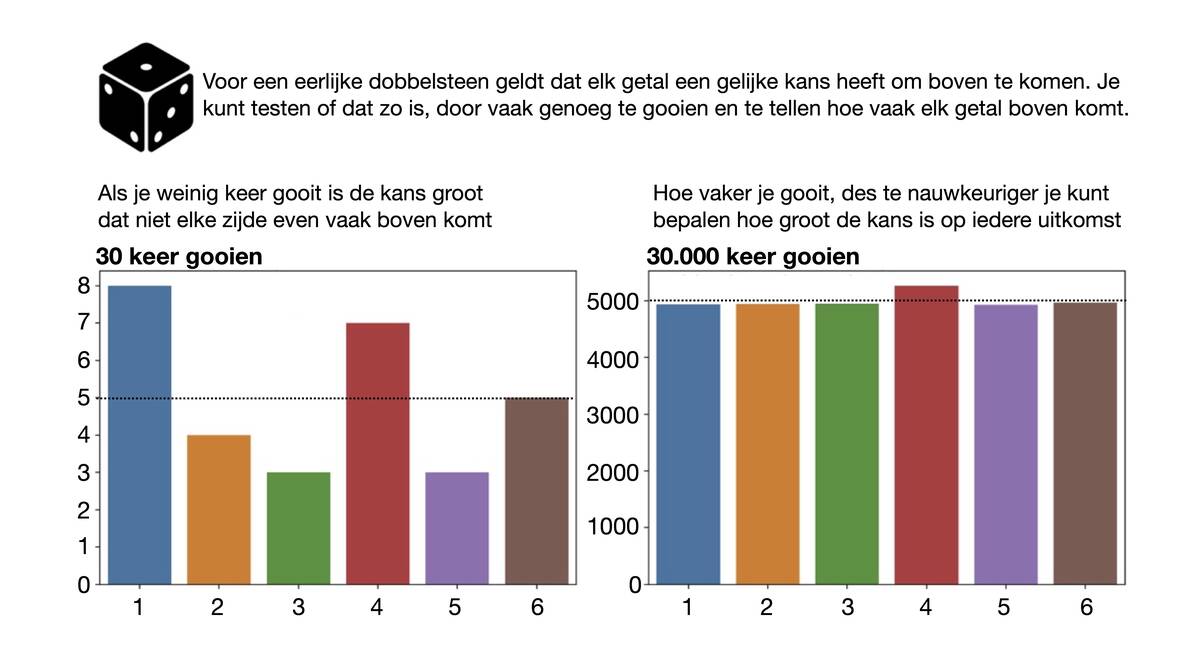 De kans om een zes te gooien kun je bepalen door heel vaak te gooien en te tellen hoe vaak je een zes gooit. In het eerste plaatje kun je zien dat hoe vaker je gooit, hoe nauwkeuriger je die kans kunt bepalen. Als je met twee dobbelstenen gooit, dan zijn de kansen op de mogelijke uitkomsten niet meer even groot. In het tweede plaatje kun je zien hoe de verdeling van de kans over de verschillende uitkomsten er dan uitziet. Deze kansverdeling verandert als je de zijde waar de zes op staat verzwaart; de kans op hogere uitkomsten neemt toe. Zoiets gebeurt ook met de klimaatdobbelsteen, naarmate de aarde verder opwarmt, neemt de kans op hoge uitschieters in temperatuur toe.