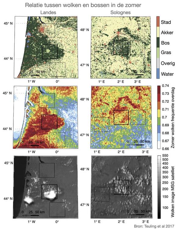 Een andere aanwijzing voor de invloed van het bos op het lokale weer ontdekten de onderzoekers dankzij orkaan Klaus in 2009. Deze storm veroorzaakte een ravage in de bossen van de Landes in het zuidwesten van Frankrijk. In de jaren daarna was de bewolking boven dit gebied beduidend minder.