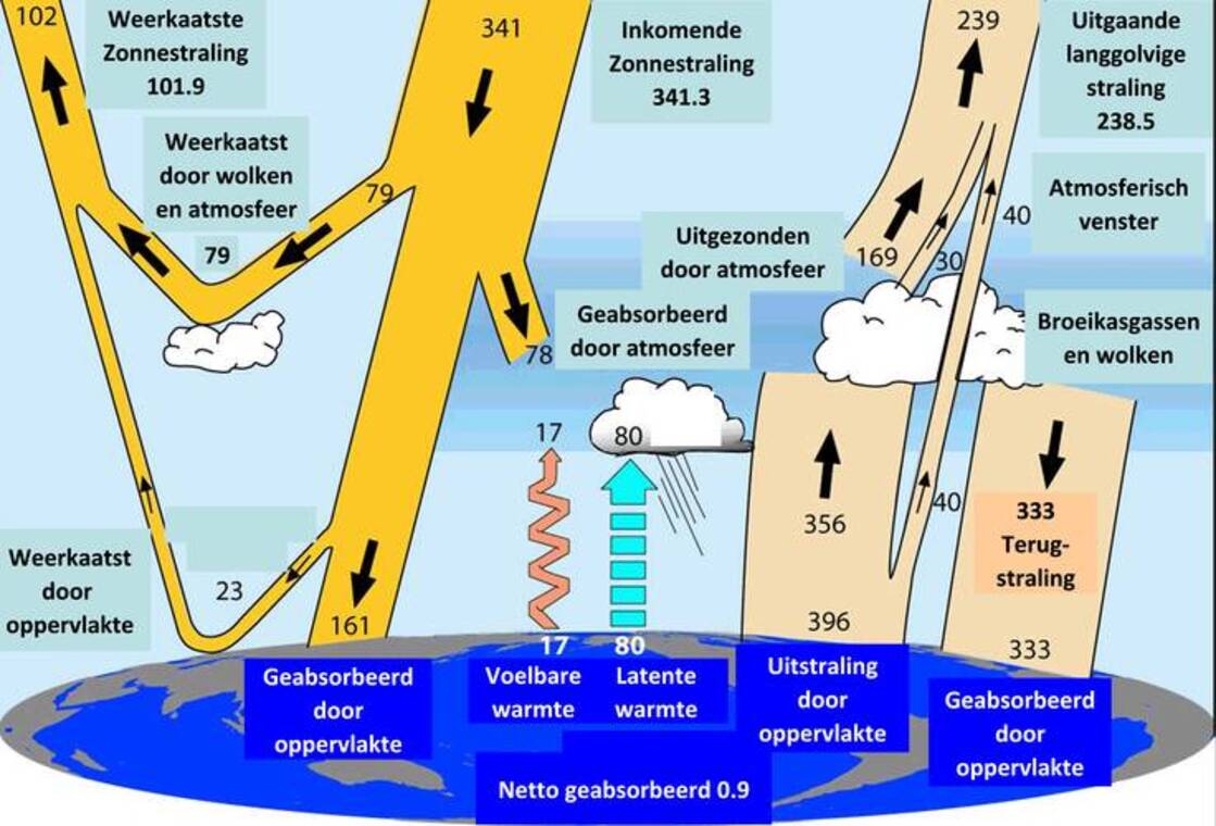 Temperaturen worden beïnvloed door straling. De zon heeft een dominante rol: zonnestraling warmt het aardoppervlak op. Echter, onopgemerkt stralen de aarde en de atmosfeer ook. Hierdoor koelt het oppervlak af. Uit de energiebalans van inkomende en uitgaande straling (Figuur 1) kan de temperatuur op aarde berekend worden.