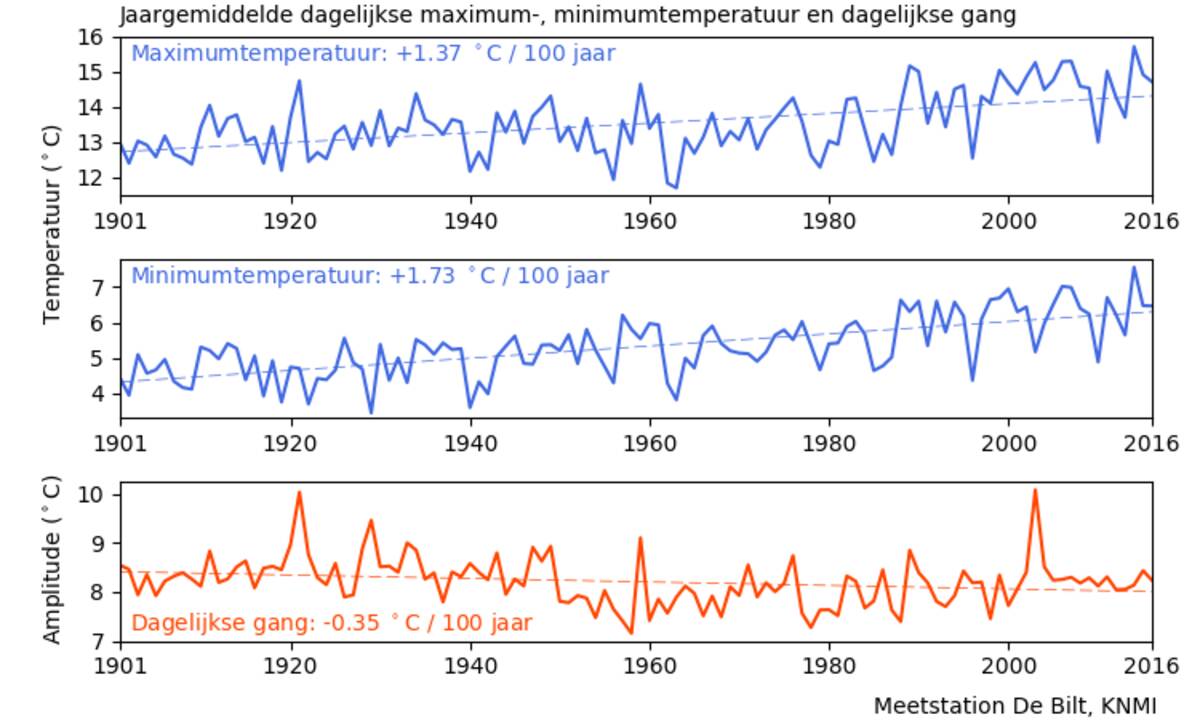 Aan de hand van de meetreeksen in De Bilt bekijken we dag- en nachttemperaturen. Zowel de maximumtemperaturen (als maat voor de dag) als de minimumtemperaturen (als maat voor de nacht) zijn gestegen sinds 1901 (Figuur 2). De dagelijkse gang, het verschil tussen de maximum- en minimumtemperatuur, is echter kleiner geworden. De Nederlandse nacht warmt sneller op dan de dag. Deze Nederlandse trend komt overeen met mondiale metingen.