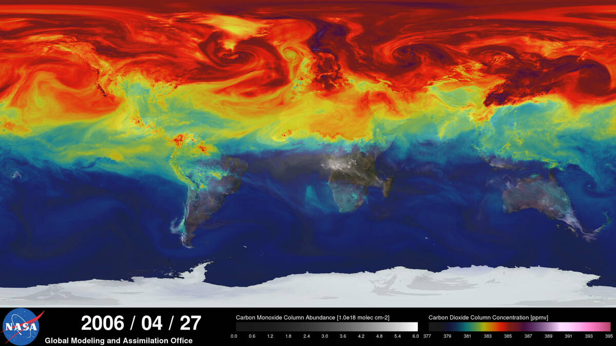 De aarde ademt van nature CO2 in en uit. In de lente en zomer nemen planten (biosfeer) meer op waardoor de CO2 concentratie daalt, in de herfst en de winter is het andersom. In het begin van de lente zijn de CO2 concentraties dan ook het hoogst. Daarnaast brengt de mensheid het hele jaar door extra CO2 in de lucht door de verbranding van olie, kool en gas en de productie van cement. Net zoals een rivier niet stopt aan de grens, verspreidt de wind de CO2 over de hele atmosfeer. Dat is goed te zien in de wereldwijde verdeling van CO2 in april 2006 (figuur 1). Het is lente op het noordelijk halfrond en hoge CO2 concentratries (rood) verspreiden zich vanaf de locaties van hoge uitstoot. Een groot deel wordt in de loop van de lente en zomer weer opgenomen als de planten weer gaan groeien. Op het zuidelijk halfrond is het herfst en zijn de concentraties laag doordat veel CO2 is opgenomen in de voorgaande lente en zomer. Deze NASA-video laat prachtig zien hoe de overtollige uitstoot zich verdeelt over de aarde en hoe de CO2 verdeling verandert met de seizoenen op beide halfronden.