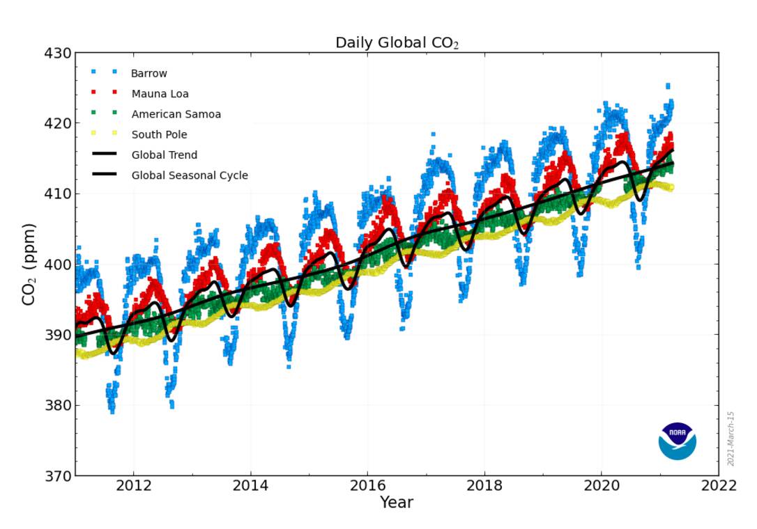 Op verschillende locaties verspreid op aarde is jarenlang iedere dag de CO2-concentratie gemeten (Figuur 2). De variaties met de seizoenen zijn duidelijk zichtbaar. Het noordelijk halfrond heeft meer landoppervlak en biosfeer dan het zuidelijk halfrond. Daardoor heeft het seizoenseffect van het noordelijk halfrond de overhand in de wereldgemiddelde concentratie (zwarte lijn). Verder zien we in alle meetpunten de CO2-concentratie jaar op jaar ongeveer even hard stijgen. Het maakt dus niet uit waar de extra uitstoot plaatsvindt, de winden mengen de CO2 wereldwijd door zodat overal de CO2 even hard stijgt.
