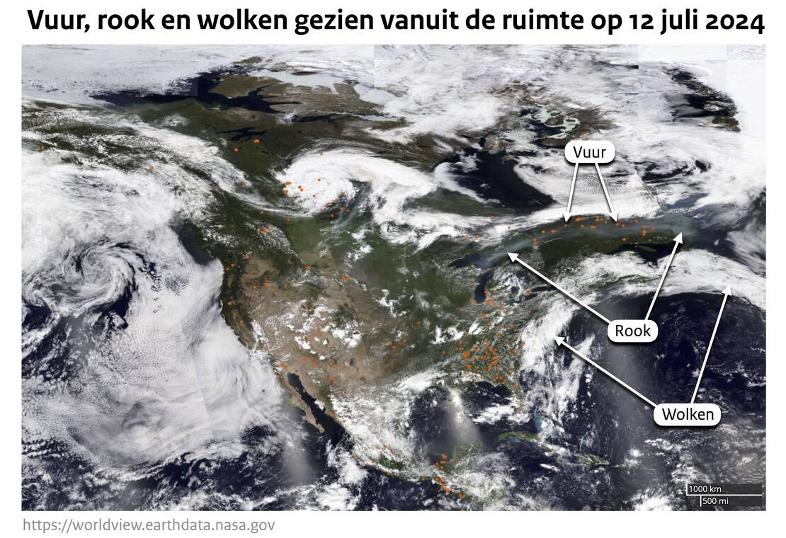 Iedere zomer ontstaan er in de uitgestrekte bossen van Canada en de Verenigde Staten bosbranden. Soms als gevolg van kampvuurtjes, meestal spontaan door bliksem in combinatie met uitgedroogde vegetatie en hoge temperaturen. Vanuit de ruimte worden bosbranden met satellieten nauwlettend in de gaten gehouden en zijn ook de rookpluimen goed te zien. In afbeelding 1 zie je met oranje stippen de vuurhaarden op 12 juli van dit jaar. Boven Oost-Canada is er een groot aantal zichtbaar omgeven door een grauwe sluier van rook.