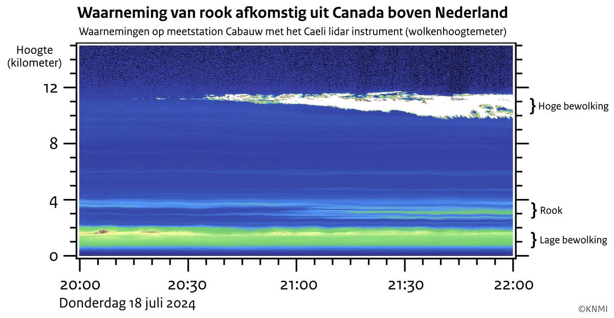 Op 18 juli meten we met de wolkenhoogtemeter van het KNMI op meetstation Cabauw naast hoge en lage bewolking ook een rooksluier op 3 tot 4 kilometer hoogte (zie afbeelding 2). In de loop van de avond wordt de rooksluier dikker. Het rode licht van de ondergaande zon schijnt door de sluier heen en wordt door de rookdeeltjes verstrooid. Gevolg: de horizon gloeit met een prachtig rood-oranje gloed.