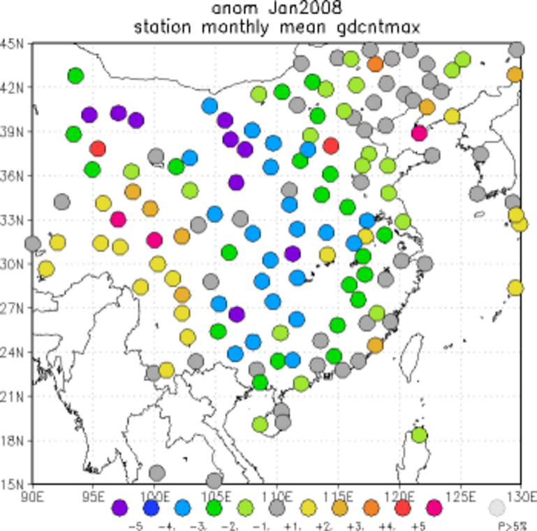 Ook het centrale deel van China was veel kouder dan normaal. De maandgemiddelde maximumtemperatuur lag hier in januari zo'n 3 à 4 graden onder normaal, waarbij de kleinste afwijkingen langs de kust waren te vinden. Zoiets komt daar gemiddeld eens in de 20 tot 100 jaar voor. De grootste problemen hingen echter samen met de voortdurende sneeuwsituaties en ijzel.