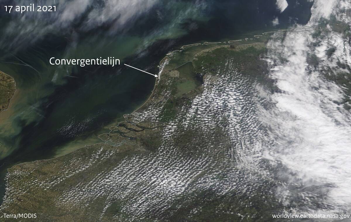 Een onzichtbaar gevaar in de onderste regionen van de atmosfeer zijn convergentielijnen. Convergentielijnen ontstaan wanneer lucht uit verschillende richtingen naar elkaar toe stroomt. Vaak gaat het om een zeewindfront wat het land op beweegt, soms tot wel 100 kilometer landinwaarts. Dit veroorzaakt stijgende lucht en kan leiden tot lokale buien, winddraaiingen en turbulentie. Maar heel vaak ontstaat er enkel bewolking op de convergentielijn en geen buien, zoals bijvoorbeeld voor de situatie in afbeelding 1. En soms ontstaat er zelfs geen bewolking (extra gevaarlijk, want onzichtbaar voor de ballonvaarder). Door de hogere temperaturen in Nederland ontstaan deze lijnen vaker en actiever. Voor ballonvaarders betekent dit risico op koerswijzigingen, moeilijk dalen of landen.