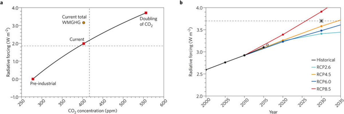 Vóór de industriële revolutie was de atmosferische CO2-concentratie nog 278 ppm (278 deeltjes CO2 per miljoen deeltjes lucht). Gemiddeld over recordjaar 2016 werd 403 ppm gemeten; een toename van iets minder dan vijftig procent. De vijftig procent van het opwarmende effect van een CO2-verdubbeling werd echter al een paar jaar eerder bereikt. De temperatuur stijgt dus niet evenredig met de CO2-concentratie. De opwarming bij lagere concentraties (van 200 naar 300 ppm, bijvoorbeeld), is groter dan die bij hogere concentraties (van 300 naar 400 ppm). Dit komt omdat een verdubbeling van CO2 altijd leidt tot eenzelfde opwarming, of je nu gaat van 200 ppm naar 400 ppm of van 300 ppm naar 600 ppm. Dit betekent ook dat een bepaalde CO2-reductie in het huidige klimaat een sterker effect heeft op de opwarming dan een gelijke CO2-afname in een toekomstig warmer klimaat. Met andere woorden: hoe eerder we beginnen met CO2-reductie, des te meer opwarming we daarmee voorkomen bij eenzelfde CO2-afname.