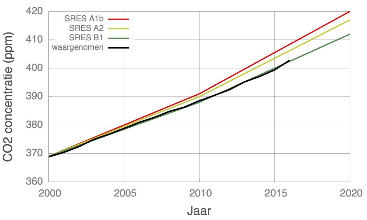 In 2000 werden de zogenaamde SRES scenario’s gepubliceerd. Voor elk scenario werd de verwachte uitstoot omgerekend naar de verwachte stijging van CO2 in de atmosfeer. De werkelijke gemeten CO2 stijging sinds 2000 is onder het meest pessimistische A1b scenario gebleven en volgt vrij precies het meer optimistische B1 scenario (Figuur 1).