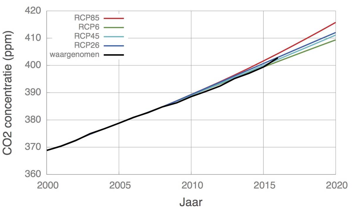 De SRES scenario's werden in 2010 opgevolgd door de RCP scenario's. Deze scenario’s verschillen in de mate waarin landen erin slagen om de uitstoot terug te dringen. In de meest groene scenario's gaan we met nieuwe technologische oplossingen netto CO2 uit de atmosfeer halen (negatieve emissies). Ook ten opzichte van deze nieuwere RCP scenario's blijft de gemeten CO2 stijging tot nu toe onder het meest pessimistische RCP8.5 scenario (Figuur 2).