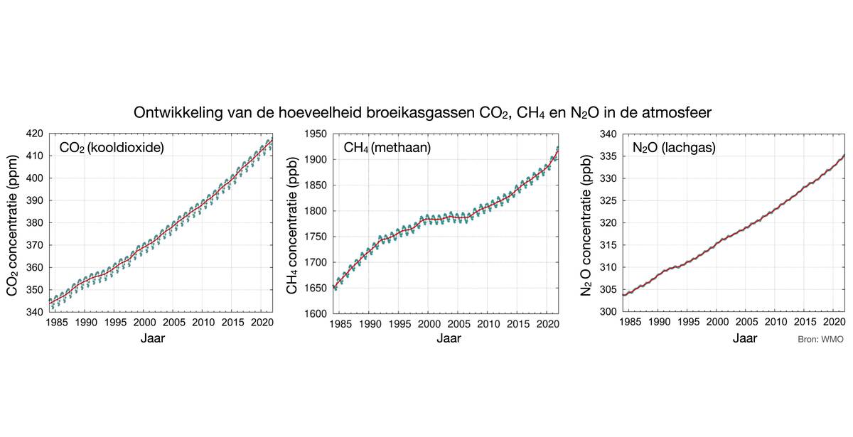 Ook in 2021 is de concentratie van de drie belangrijkste broeikasgassen koolstofdioxide, methaan, en stikstofoxide (lachgas) verder gestegen (figuur 1). Dat blijkt uit het jaarlijkse rapport over broeikasgassen van de Wereld Meteorologische Organisatie (WMO). Niet eerder nam methaan zo snel toe sinds het begin van de metingen veertig jaar geleden. De oorzaak van de versnelde stijging is nog niet duidelijk, mogelijk dragen zowel menselijke activiteiten als natuurlijke processen bij aan deze versnelling. Tussen 1990 en 2021 is de broeikaswerking van deze gassen met 50% toegenomen. De grootste bijdrage komt van de toename van CO2 (80%).
