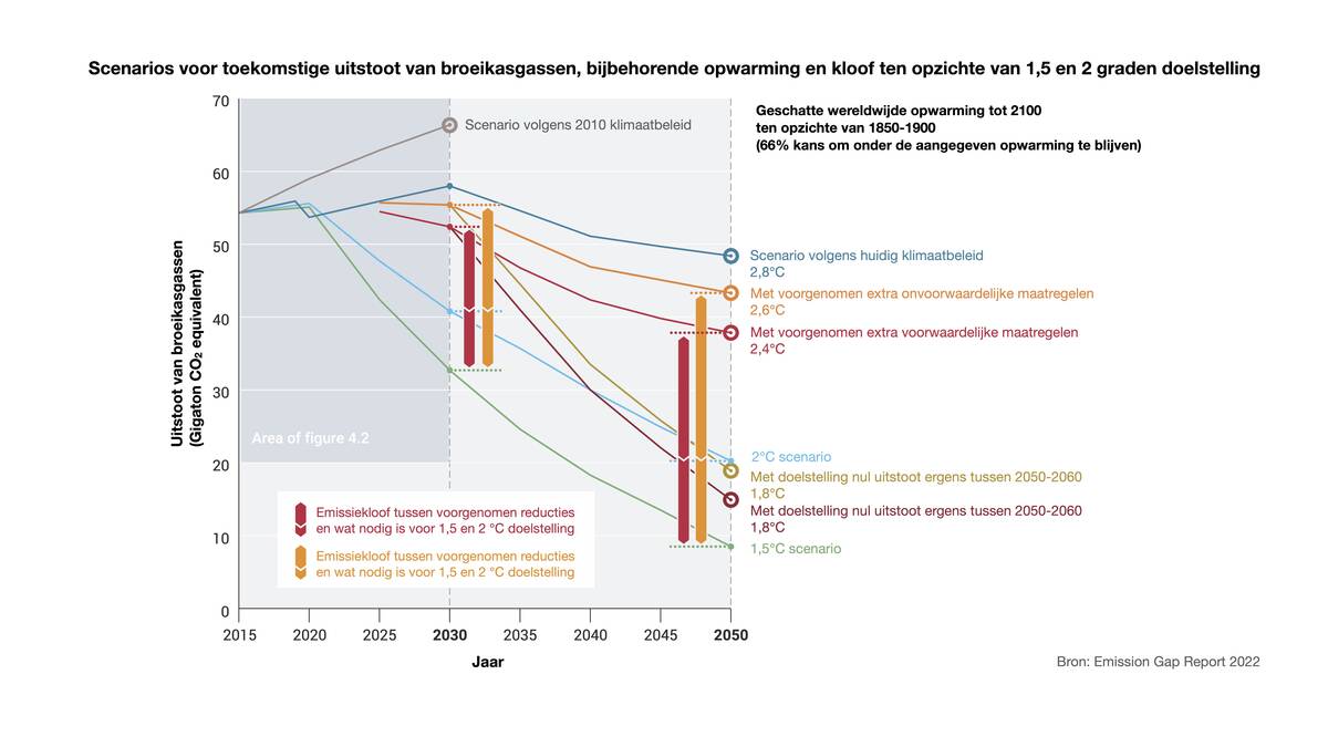 Ieder jaar berekent het VN-milieuprogramma UNEP de kloof tussen de voorgenomen reductie in uitstoot van broeikassen en de mindering die nodig is om de opwarming tot onder de 2 graden te beperken (de emissiekloof). Het UNEP-rapport over de recente emissiekloof signaleert dat de wereld de emissiereducties die waren beloofd tot 2030 niet haalt. Bovendien leidt het huidige klimaatbeleid tot 2,8 °C opwarming in 2100 ten opzichte van het pre-industrieel niveau (figuur 2). Met de extra maatregelen die landen hebben aangekondigd komt de opwarming uit op 2,4 tot 2,6 graden. Het is in theorie nog mogelijk om de opwarming te beperken tot 1,8 graden als de landen met een nul-uitstoot doelstelling rond 2050-2060 dat daadwerkelijk ook halen, maar op dit moment is dit scenario niet geloofwaardig volgens UNEP.